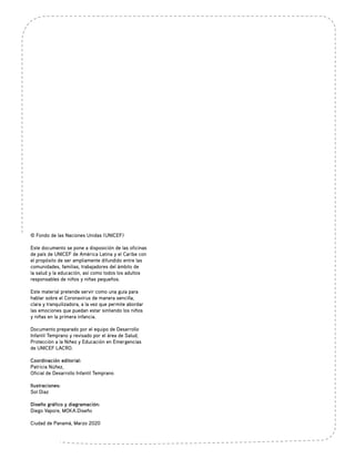 Este documento proporciona una guía para hablar con niños pequeños sobre el coronavirus de manera sencilla y tranquilizadora. Explica brevemente qué es el coronavirus, cómo se transmite de persona a persona, los posibles síntomas, y consejos para mantenerse seguros como lavarse las manos frecuentemente. También aborda las emociones que los niños pueden estar sintiendo durante esta situación y valida que es normal sentirse preocupado, triste u otras emociones.