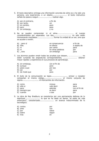 1. El documento presenta una guía de ejercitación sobre el manejo de conectores y la redacción de textos. Incluye 12 ejercicios sobre el uso adecuado de conectores y 6 ejercicios sobre el orden correcto de párrafos en textos.