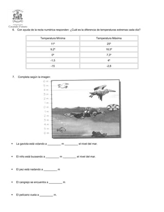 Este documento presenta una guía de aprendizaje sobre operaciones básicas con números enteros. Incluye ejercicios para representar números enteros en una recta numérica, calcular valores absolutos, interpretar situaciones utilizando números enteros, y completar tablas de sumas y restas con números enteros positivos y negativos. El objetivo es que los estudiantes practiquen conceptos básicos sobre números enteros como su representación, cálculo de valores absolutos, interpretación en contextos reales, y realización de operaciones aritméticas.