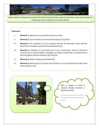 La guía introduce el concepto de patrimonio cultural y natural. Explica que el patrimonio cultural incluye bienes tangibles e intangibles que representan la cultura de un pueblo, mientras que el patrimonio natural incluye formaciones físicas y biológicas de valor estético o científico. Además, la guía busca que los estudiantes comprendan la importancia de valorar el patrimonio por su arquitectura pero también a través de la cultura y naturaleza de un lugar.