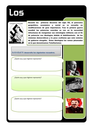 Los documentos describen las características de los regímenes totalitarios en comparación con los estados liberales. Los estados totalitarios buscan organizar completamente la sociedad según una ideología unificadora mediante la coerción, mientras que los estados liberales administran la sociedad para permitir el desarrollo individual y económico sin limitar la libertad. Los elementos clave de los totalitarismos incluyen un partido único, un dictador absoluto, la ideología como guía de la sociedad, el uso del terror, y la movilización total de la