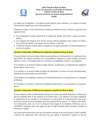 El documento presenta una serie de 6 ejercicios de diseño de modelo entidad-relación (MER) para diferentes requisitos de bases de datos. El primer ejercicio pide diseñar un MER para una base de datos de una agencia de seguros que registre personas, vehículos, accidentes y multas. El segundo ejercicio solicita un MER para una empresa de alquiler de vehículos que registre oficinas, vehículos, alquileres y clientes. El tercer ejercicio pide un MER para una universidad que registre miembros como estudiantes, profesores,