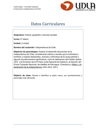 El documento resume la última etapa de la independencia de Chile conocida como la "Patria Nueva", la cual comenzó tras la victoria patriota en la batalla de Chacabuco en 1817 y terminó con la abdicación de Bernardo O'Higgins en 1823. Durante este período, O'Higgins consolidó la independencia como Director Supremo y proclamó oficialmente la independencia de Chile en 1818. Sin embargo, las tropas realistas derrotaron a los patriotas en la batalla de Cancha Rayada. El documento guía a los estudiantes sobre este per