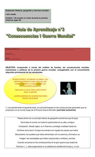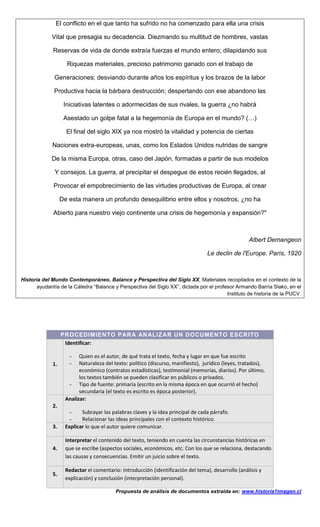 Este documento presenta un extracto de un texto francés de 1920 titulado "El declive de Europa" que analiza las consecuencias de la Primera Guerra Mundial para Europa. El autor argumenta que la guerra debilitó a Europa al diezmar sus poblaciones, dilapidar sus riquezas y desviar su producción a la destrucción bélica. Esto habría dado paso al ascenso de naciones extraeuropeas como Estados Unidos y Japón, abriendo una crisis de hegemonía para el viejo continente. El documento instruye además a