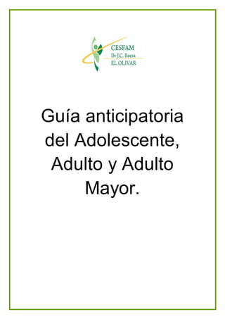 Este documento presenta una guía para la atención y cuidado de la salud integral de adolescentes, adultos y adultos mayores. Incluye objetivos, temas claves y recomendaciones sobre la atención de salud, hábitos de vida saludables, sexualidad, enfermedades de transmisión sexual, planificación familiar, exámenes preventivos y más, para cada grupo etario. La guía busca entregar herramientas que permitan fomentar estilos de vida saludables y prevenir problemas de salud a través de controles regulares y educación