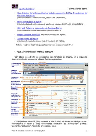 Este documento presenta una guía básica del uso de BSCW, un software para trabajo cooperativo en línea. Explica cómo registrarse como usuario, personalizar la interfaz, usar carpetas y archivos compartidos, y recibir notificaciones de cambios. El objetivo es mostrar las funciones principales de BSCW para facilitar el trabajo en grupo a través de Internet.