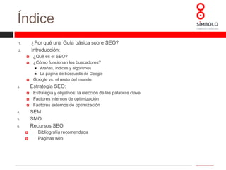 La guía básica de SEO presenta los fundamentos esenciales del posicionamiento en buscadores, explicando conceptos clave como el SEO, la elección de palabras clave y la importancia de los factores internos y externos de optimización. Se enfatiza que el SEO es accesible y que su entendimiento ayuda a evitar promesas engañosas en el ámbito digital. Además, se abordan estrategias relacionadas con SEM y SMO, y se recomienda bibliografía para profundizar en el tema.