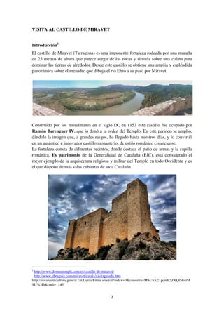 El castillo de Miravet fue construido originalmente por los musulmanes en el siglo IX y luego ampliado por los templarios en el siglo XII. A lo largo de los siglos, el castillo cambió de manos entre los templarios, la Orden del Hospital, y diferentes facciones durante varias guerras. Finalmente fue cedido a la Generalitat de Catalunya en 1990 y abierto al público en 1994 después de su restauración.
