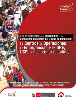 Este documento presenta lineamientos para la constitución de Comisiones de Gestión del Riesgo de Desastres y Centros de Operaciones de Emergencias en Direcciones Regionales de Educación, Unidades de Gestión Educativa Local e instituciones educativas. Explica la importancia de implementar estas instancias para mejorar la prevención, preparación y respuesta ante desastres. Además, describe los pasos para formar las comisiones, sus funciones, y la organización y funciones de los Centros de Operaciones de Emergencia a diferentes niveles del sector educación