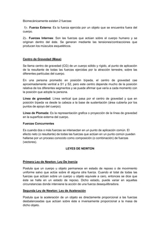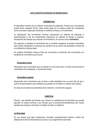 1) La guía presenta conceptos básicos de biomecánica, incluyendo cinemática (descripción del movimiento sin fuerzas), cinética (fuerzas que inducen movimiento), y leyes de Newton. 2) Explica que el esqueleto humano funciona como un sistema de palancas y describe los tres tipos de palancas. 3) Detalla cómo las fuerzas afectan los tejidos y el desarrollo óseo, el cual es más maleable durante la juventud.