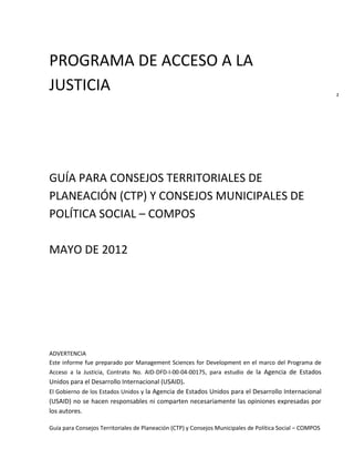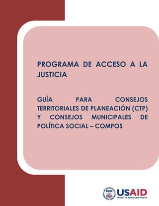 Este documento presenta una guía sobre los Consejos Territoriales de Planeación (CTP) y los Consejos Municipales de Política Social (COMPOS). Explica que los CTP son instancias de participación ciudadana que discuten los planes de desarrollo territorial, mientras que los COMPOS coordinan las instituciones públicas y privadas para la implementación de políticas sociales a nivel municipal. Además, describe las funciones y composición de ambos consejos, así como su importancia y soporte legal de acuerdo con la Constitución y las leyes colombianas.