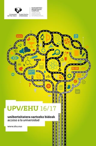Este documento proporciona información sobre los diferentes caminos para acceder a estudios universitarios oficiales de grado en la UPV/EHU, incluyendo la entrada desde el bachillerato, ciclos formativos de grado superior, para mayores de 25 y 45 años, y mediante la acreditación de experiencia laboral. También detalla el procedimiento de ingreso a la UPV/EHU y el calendario de trámites para el curso 2016/2017, así como los centros y titulaciones ofertados.