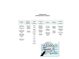 Este documento habla sobre cómo investigar en Internet de manera efectiva. Explica que hay que saber con precisión qué se busca antes de comenzar a explorar la red, y que Internet es más que una herramienta para conectarse con amigos, sino también una valiosa fuente de información. Además, detalla las diferentes fuentes de información primarias, secundarias y terciarias y cómo determinar si un recurso en particular es relevante para la investigación mediante el cuestionamiento de su necesidad.