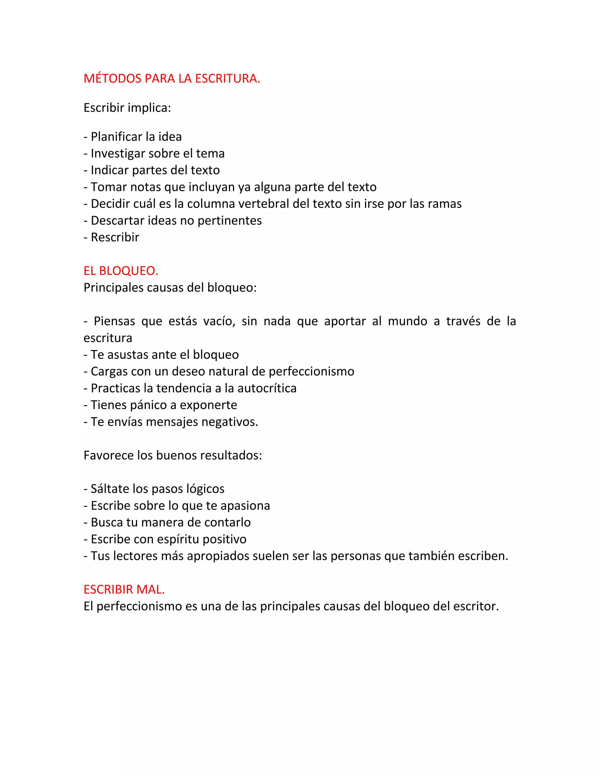 Este documento proporciona numerosos métodos y consideraciones para la escritura creativa. Describe técnicas como el binomio fantástico, el cadáver exquisito y escribir a partir de fotografías, e incluye secciones sobre cómo evitar el bloqueo del escritor, la importancia de la simplicidad y transparencia en el estilo, y diferentes formas de estructurar una historia como la trama y el punto de vista del narrador. El objetivo general es ofrecer una amplia gama de herramientas y consejos para estimular