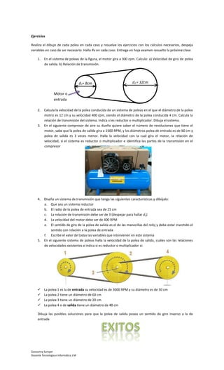 Este documento presenta una guía de estudio sobre poleas y transmisiones. Explica qué son las transmisiones y sus tipos principales: reductores de velocidad y multiplicadores de velocidad. Describe algunas aplicaciones comunes como sistemas de transmisión en automotores y bandas transportadoras. Además, incluye fórmulas matemáticas para calcular velocidades y relaciones de velocidad en sistemas de poleas. Finalmente, proporciona ejercicios prácticos para aplicar estos conceptos.