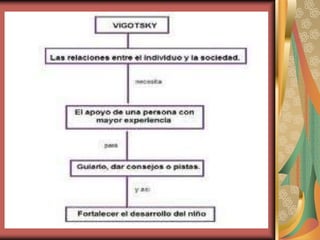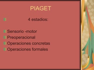 Este documento presenta un resumen de los cuatro estadios del desarrollo cognitivo según Piaget y de la teoría de Vigotsky sobre la zona de desarrollo próximo. Explica brevemente cada uno de los estadios de Piaget: sensoriomotor, preoperacional, operaciones concretas y operaciones formales. También resume la teoría de Vigotsky sobre cómo el aprendizaje ocurre a través de la interacción social guiada y la imitación con adultos o pares más capaces.