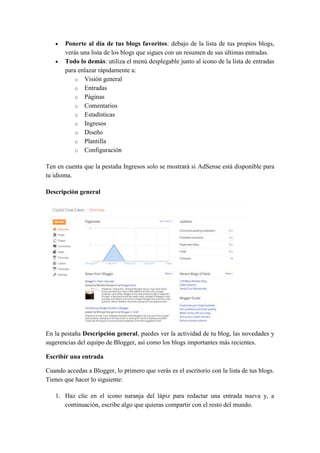 Este documento ofrece una guía introductoria sobre cómo crear y personalizar un blog en Blogger. Explica cómo crear una cuenta de Blogger vinculada a Google, crear un nuevo blog eligiendo un nombre, URL y plantilla, y aprender las funciones básicas como escribir entradas, añadir imágenes, vídeos y gadgets, y configurar la privacidad y permisos.