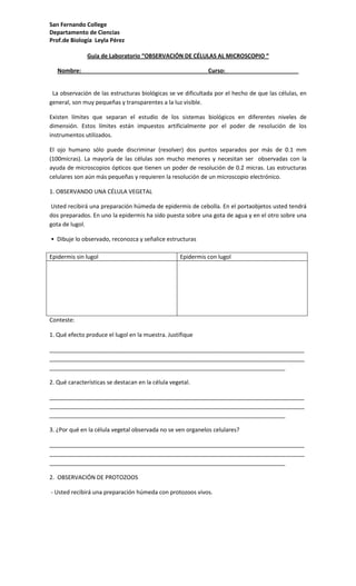 Este documento presenta una guía de laboratorio sobre la observación de células al microscopio. Explica que las células son demasiado pequeñas para ser vistas a simple vista y requieren el uso de microscopios. La guía instruye a los estudiantes a observar células vegetales de cebolla, protozoos y células epiteliales humanas, dibujando sus características y respondiendo preguntas sobre las estructuras celulares y sus funciones.