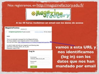 Este documento proporciona instrucciones para crear una revista digital colaborativa gratuita utilizando la plataforma Magazine Factory. Explica cómo registrarse, configurar la revista eligiendo idioma, nombre, secciones y roles de usuario, y administrar y publicar contenido en la revista una vez creada.