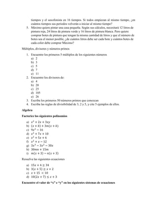 Este documento presenta varios problemas y ejercicios de matemáticas en las áreas de regla de tres, MCM y MCD, múltiplos, divisores y números primos, álgebra y funciones. Incluye 15 problemas de regla de tres, 5 problemas de MCM y MCD, 5 ejercicios sobre múltiplos, divisores y números primos, 9 ejercicios de álgebra y 5 problemas de funciones. El documento proporciona una guía de problemas para practicar diferentes temas matemáticos.