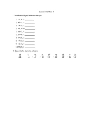La guía presenta una serie de ejercicios de ordenación numérica y adición para estudiantes de matemáticas de segundo grado. Primero, pide ordenar 10 conjuntos de 3 dígitos cada uno de menor a mayor. Luego, solicita desarrollar 9 adiciones sumando los dígitos correspondientes de dos columnas numéricas.