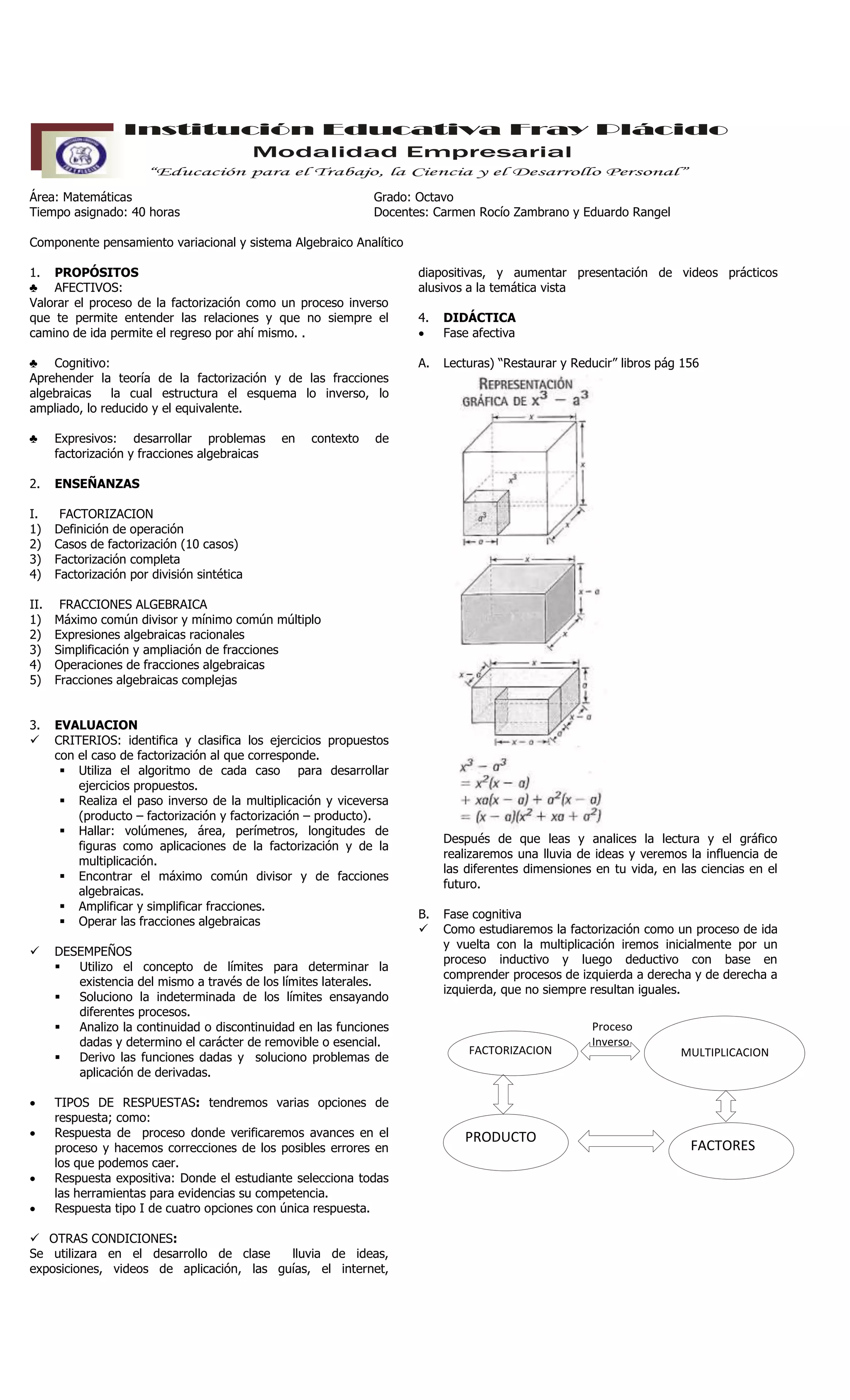 El documento presenta el plan de estudios para la enseñanza de la factorización y fracciones algebraicas en el grado octavo. El plan incluye objetivos afectivos y cognitivos, temas como la factorización y operaciones con fracciones algebraicas, criterios de evaluación, y recursos como libros y videos para apoyar la enseñanza. Los docentes utilizarán métodos inductivos y deductivos, algoritmos, modelación y simulación para que los estudiantes aprendan los conceptos y desarrollen problemas en este campo.