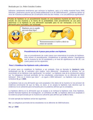 Este documento presenta los conceptos básicos de intervalos de confianza y pruebas de hipótesis. Explica qué son las hipótesis nula y alternativa, y los cuatro pasos para realizar una prueba de hipótesis: 1) establecer las hipótesis, 2) determinar el criterio de decisión, 3) calcular el estadístico de prueba, y 4) tomar una decisión y conclusión. También cubre cómo realizar pruebas de hipótesis para una media poblacional y para comparar dos medias poblac