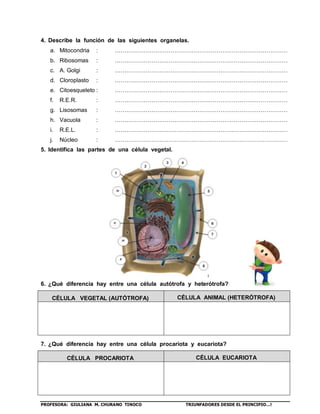 El documento presenta un examen de biología sobre células para estudiantes de primer año de secundaria. El examen contiene preguntas sobre la historia de la célula, las partes de células animales y vegetales, y las diferencias entre células procariotas y eucariotas. También pide definir varios términos biológicos relacionados con la célula. La profesora Giuliana M. Churano Tinoco proporciona el examen para que los estudiantes demuestren su comprensión de la lección sobre