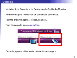Este documento proporciona una guía sobre cómo instalar y utilizar la herramienta Cuadernia para crear contenidos educativos. Explica cómo descargar e instalar Cuadernia en un pendrive, crear y editar cuadernos con páginas, objetos, texto, imágenes, vídeos y actividades interactivas, y ver los cuadernos creados.