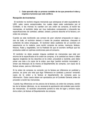 El documento presenta los beneficios que ofrece un software contable a una empresa, como rapidez y oportunidad en la información, mayor volumen de producción, protección contra errores, preparación automática de informes e impresión automática de documentos. También describe las operaciones que facilita un software contable, como registrar y procesar transacciones de compras, ventas, cuentas por cobrar/pagar, inventarios, balances, producción, nóminas, entre otras. Finalmente, explica el proceso de recepción de inventarios, detallando los pasos