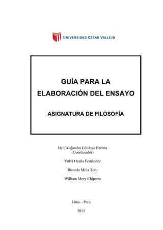 Este documento presenta una guía para la elaboración de ensayos en la asignatura de filosofía de la Universidad César Vallejo. Explica que el tipo de ensayo a desarrollar será el argumentativo. Detalla los pasos para su elaboración, incluyendo la formación de grupos de dos estudiantes, la selección de un tema, la búsqueda de información y la organización de la estructura. Esta comprende título, introducción, desarrollo y conclusión. El desarrollo, con un mínimo de 7 u 8 p