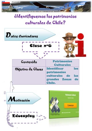 Este documento presenta una guía educativa sobre los patrimonios culturales de Chile. La guía incluye objetivos de aprendizaje, datos curriculares, actividades motivadoras, preguntas para identificar las principales manifestaciones culturales de las distintas zonas geográficas del país y sugerencias para proyectos sobre el patrimonio cultural regional.
