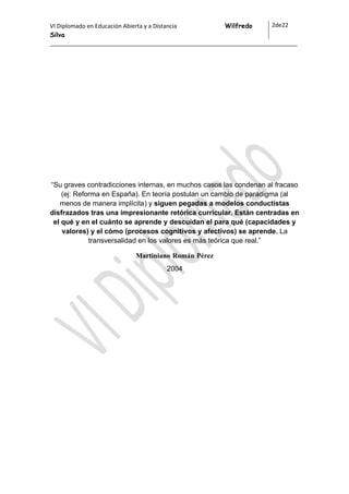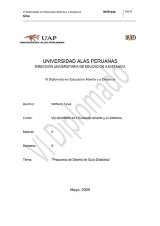 Este documento presenta un proyecto de guía didáctica para la asignatura de Psicología Educativa. Introduce la asignatura y sus objetivos de estudiar los fundamentos psicológicos de la educación y su aplicabilidad. Describe las 8 sesiones que componen la asignatura y la orientación tutorial continua del docente. Finalmente, presenta las credenciales del docente-tutor Wilfredo Silva, licenciado en psicología con estudios de maestría en psicología educativa.