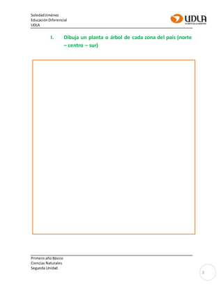 El documento presenta una guía didáctica para primer año básico sobre la flora de Chile. El objetivo es conocer diversas plantas del país considerando sus características y proponiendo medidas para su cuidado. La guía incluye instrucciones para dibujar plantas o árboles de las zonas norte, centro y sur de Chile, y responder preguntas verdadero o falso sobre especies como el Metarma, la Avellanita y el Azulillo.