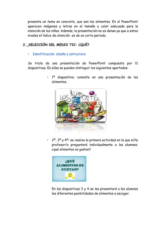 Este documento presenta una guía didáctica para enseñar a niños en edad preescolar sobre alimentación saludable. La guía propone utilizar una presentación de PowerPoint con tres actividades: 1) identificar alimentos favoritos, 2) ubicarlos en una pirámide alimenticia, y 3) resolver adivinanzas sobre frutas en un video. El objetivo es incentivar una dieta balanceada desde una edad temprana de manera entretenida e interactiva.