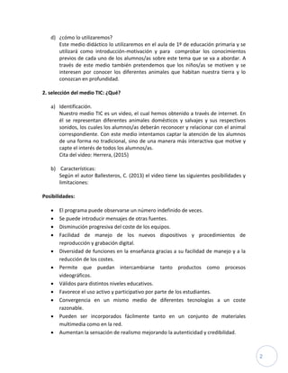 Este documento presenta una guía didáctica para utilizar un video sobre los animales según su hábitat con estudiantes de primer grado. El video se usará para motivar a los estudiantes y revisar sus conocimientos previos sobre los animales antes de explicar el tema. Después de ver el video, los estudiantes participarán en una actividad para identificar los sonidos de los animales. El objetivo es que los estudiantes aprendan a reconocer diferentes animales y relacionarlos con sus hábitats y sonidos respectivos.