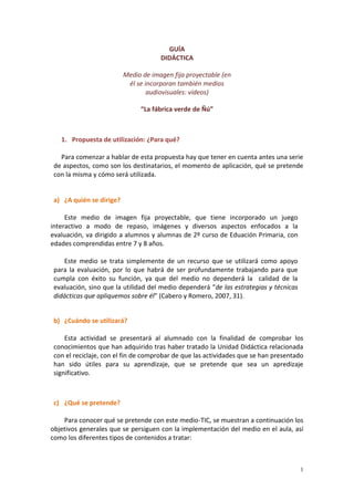 Este documento presenta una guía didáctica para evaluar el aprendizaje de estudiantes de segundo grado de primaria sobre el tema del reciclaje utilizando un medio de imagen fija proyectable con videos. El medio contiene 14 diapositivas con sopas de letras, frases para completar y actividades manuales relacionadas con los diferentes tipos de contenedores de reciclaje. El objetivo es evaluar de forma lúdica los conocimientos conceptuales, procedimentales y actitudinales de los estudiantes sobre el reciclaje a trav