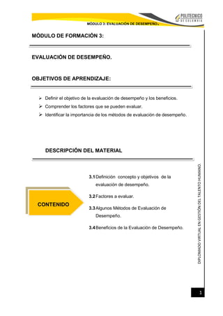 El documento habla sobre la evaluación del desempeño en el ámbito laboral. Explica que la evaluación del desempeño es un proceso para determinar cómo los empleados están realizando su trabajo y para establecer planes de mejora. Identifica factores como la calidad, cantidad y conocimiento del trabajo que pueden ser evaluados, así como métodos de evaluación como la escala gráfica, elección forzada e investigación de campo. El objetivo general es mejorar el desempeño de los empleados y tomar decisiones administrativas sobre capacitación, ascensos y mejor