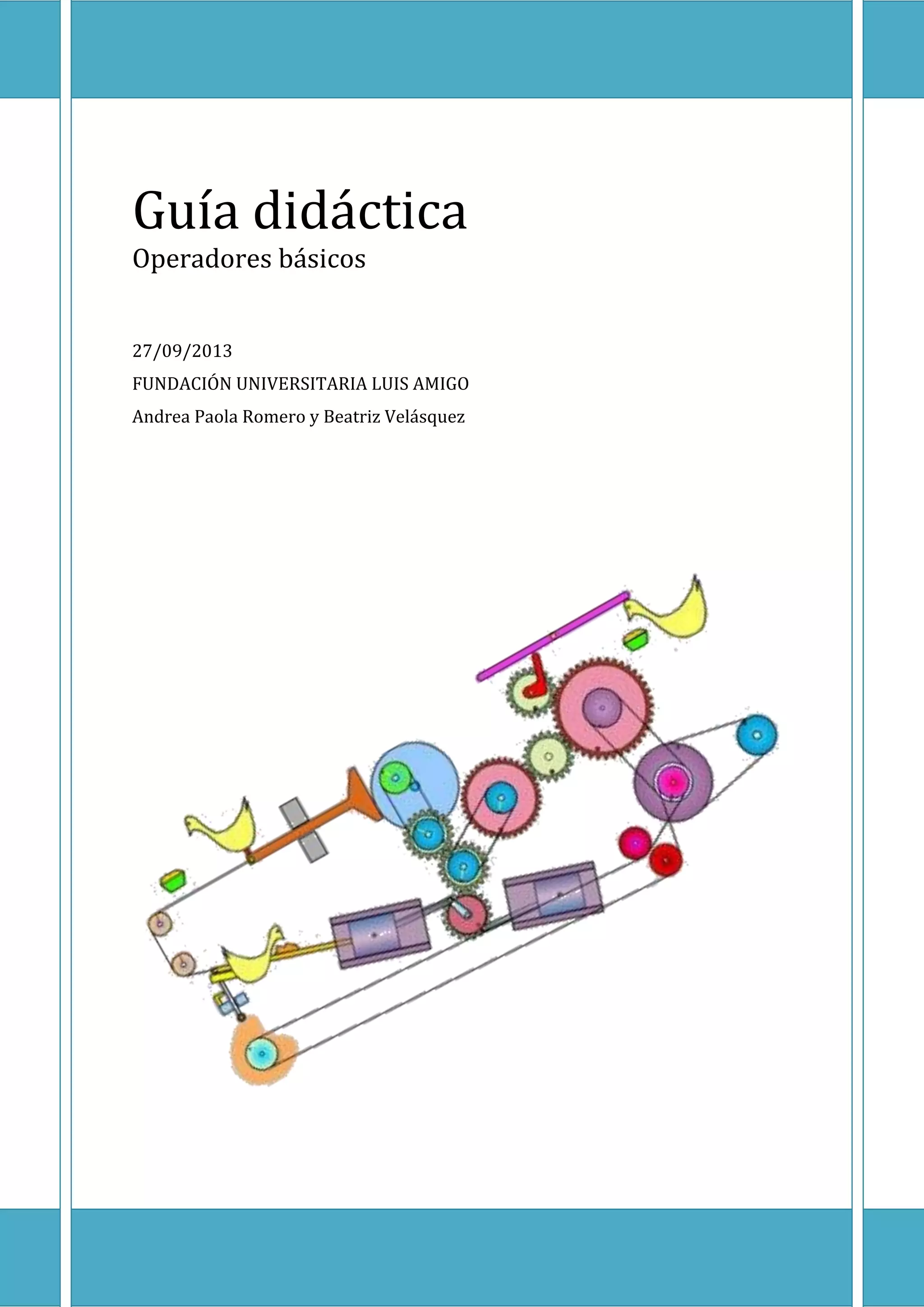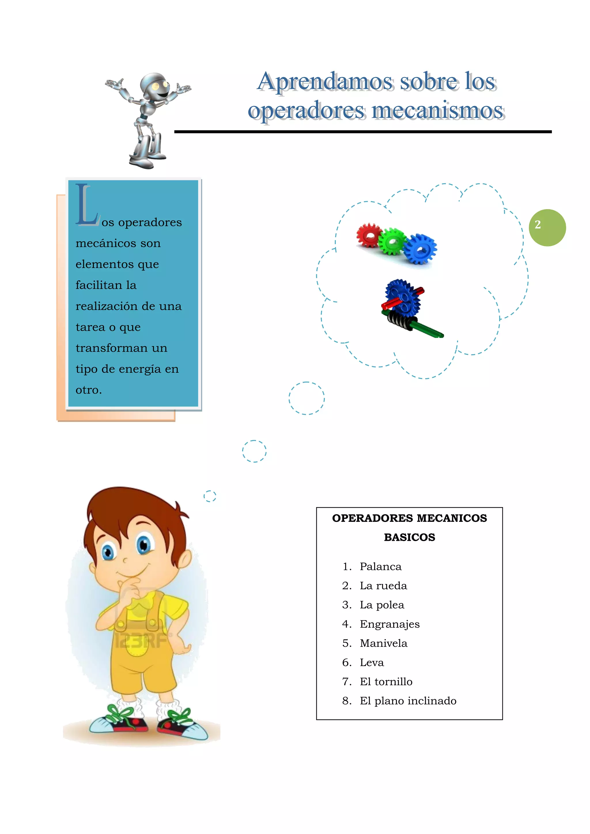 Este documento presenta una guía didáctica sobre los operadores mecánicos básicos como la palanca, la rueda, la polea, los engranajes, la manivela, la leva, el tornillo y el plano inclinado. Explica qué son cada uno de estos operadores, sus partes y cómo funcionan, proporcionando ejemplos. El objetivo es facilitar la comprensión de estos elementos mecánicos fundamentales.