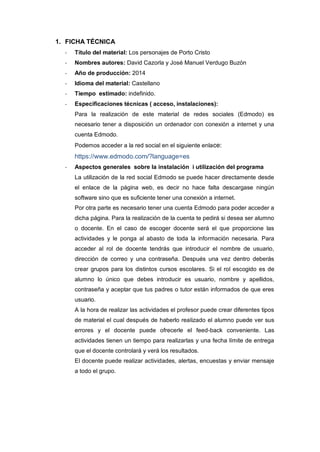 Este documento presenta una guía didáctica para utilizar la red social Edmodo con estudiantes de tercer grado de primaria. El objetivo es familiarizar a los estudiantes con los personajes más importantes de Porto Cristo y enseñarles cómo usar Edmodo. El profesor creará cuentas, conducirá una sesión introductoria en el aula de computación y asignará tareas que los estudiantes completarán individualmente en casa utilizando Edmodo.