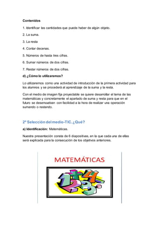 Este documento presenta una guía didáctica para el uso de una presentación de diapositivas sobre matemáticas para estudiantes de primer ciclo. La presentación consta de 6 diapositivas y se utilizará para introducir las lecciones sobre suma y resta con el objetivo de que los estudiantes desarrollen habilidades básicas en operaciones matemáticas. La guía describe las actividades que tendrán lugar antes, durante y después de la presentación.
