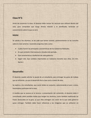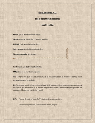 Este documento presenta una guía docente para una clase de historia sobre los gobiernos radicales en Chile entre 1938 y 1952. La clase se divide en tres partes: una introducción donde los estudiantes recapitulan lo aprendido anteriormente, un desarrollo donde analizan los cambios sociales durante este período a través de la lectura y discusión de una guía de aprendizaje, y un cierre donde resuelven dudas y se les recuerda la tarea para la próxima clase. El objetivo es que los estudiantes comprendan el impact