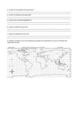 Este documento es una guía de historia y geografía para estudiantes de cuarto año. Les pide a los estudiantes que localicen países y ciudades del mundo y de América usando coordenadas geográficas e indiquen su latitud y longitud. También les pide que respondan preguntas sobre conceptos como la red de coordenadas geográficas, la rosa de los vientos, los paralelos y meridianos más importantes, y el significado de latitud y longitud. Finalmente, les pide a los estudiantes que dibujen