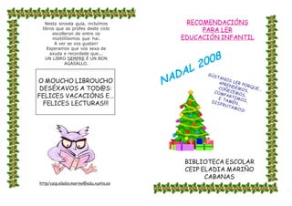 Este documento presenta una selección de libros recomendados para estudiantes de educación infantil de una biblioteca escolar en Cabanas, Galicia. Incluye el título y editor de varios libros populares para niños pequeños como Os amigos de Elmer, Chocolata y Pino se viste solo. El documento anima a los estudiantes a disfrutar de la lectura durante el verano y recuerda que un libro siempre es un buen regalo.