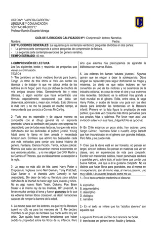 Este documento presenta una guía de ejercicios de comprensión lectora y producción escrita narrativa para un curso de 7° básico. La guía contiene dos secciones: la primera consiste en 15 preguntas sobre dos textos, mientras que la segunda propone ejercicios de género narrativo. El tiempo estimado para completar la guía es de 40 minutos.