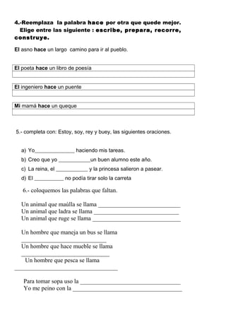 Este documento presenta una guía sobre gramática que incluye ejercicios sobre el abecedario, ordenar palabras alfabéticamente, identificar sinónimos, reemplazar palabras, completar oraciones con verbos ser y estar, subrayar sustantivos comunes y propios, escribir diminutivos y aumentativos, completar oraciones con artículos determinantes e indefinidos, y encontrar frutas escondidas.