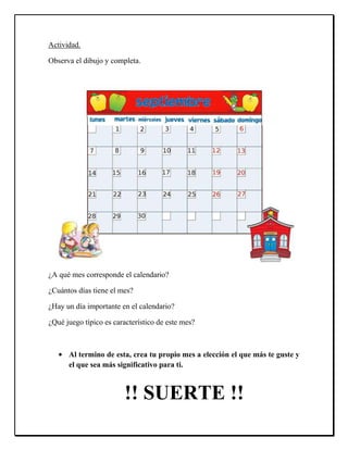 Este documento presenta una guía para una actividad de matemáticas para estudiantes de 2o básico sobre el calendario. La actividad introduce conceptos como días, semanas, meses y fechas, e instruye a los estudiantes a crear un calendario grupal identificando eventos importantes como cumpleaños, vacaciones y días festivos. El propósito es que los estudiantes aprendan a reconocer y utilizar la información presentada en un calendario.