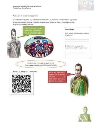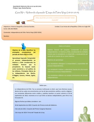 La guía tiene como objetivo identificar las principales características del período de Patria Vieja en Chile entre 1810 y 1814. Incluye actividades para comprender factores que precipitaron la independencia como su impacto social y rol de líderes militares como San Martín y O'Higgins. El documento presenta el contexto del proyecto de usar comics para explicar el proceso independentista considerando múltiples factores.