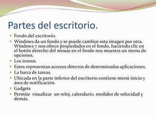 Microsoft Windows es un conjunto de programas que permite administrar los recursos de una computadora y ejecutar el hardware desde los niveles más básicos. El documento describe las partes principales del escritorio de Windows como el fondo, iconos, barra de tareas y gadgets. También explica conceptos como archivos, carpetas, accesos directos, copiar, mover y pegar archivos, y la papelera de reciclaje y portapapeles. Finalmente, cubre temas como el explorador, panel de control e instalación de impresoras.