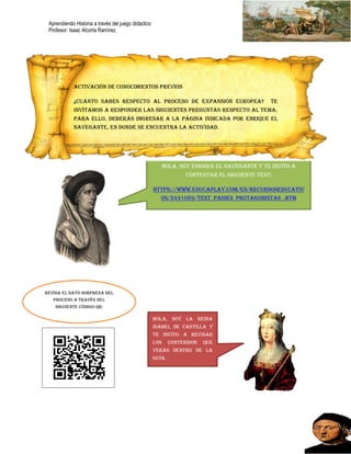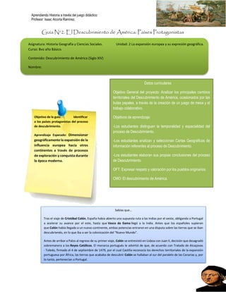 La guía se enfoca en identificar a los países protagonistas del descubrimiento de América. Analiza los viajes exploratorios de Portugal y España a través de mapas, identificando los territorios conquistados por cada corona. Los estudiantes construyen un juego de mesa sobre el tema y evalúan cómo los nuevos descubrimientos afectaron aspectos políticos, económicos, culturales y sociales en Europa y las tierras conquistadas.